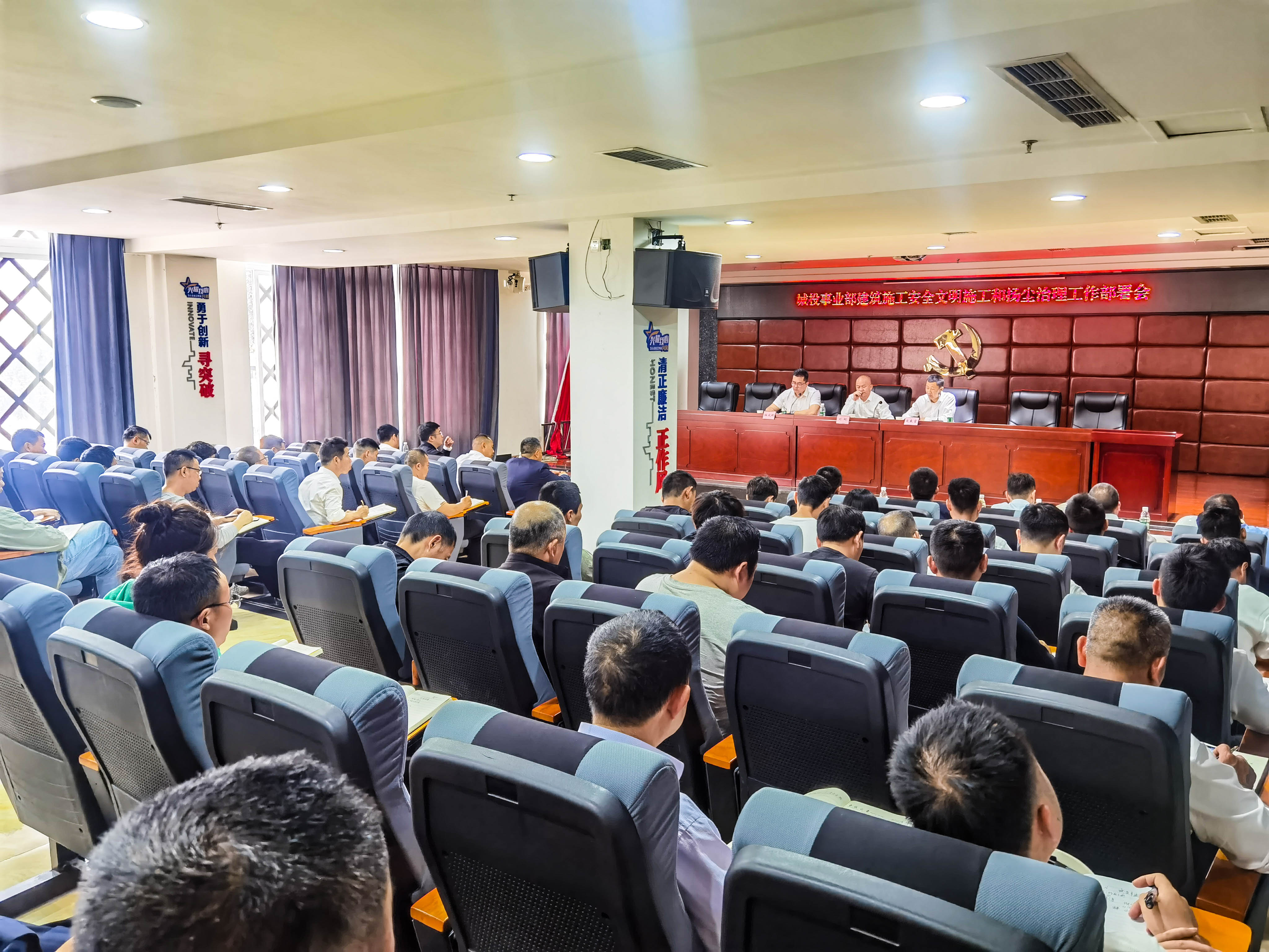 觀摩結(jié)束后召開建筑施工安全文明施工和揚(yáng)塵治理工作部署會。會上,城投事業(yè)部各公司負(fù)責(zé)人作交流發(fā)言。劉總肯定了近年來公司在項目管理工作中取得的成績,分析了當(dāng)前形勢下項目管理面臨的挑戰(zhàn),并指出項目管理過程中需要高度關(guān)注的突出問題,對下步工作作安排部署。